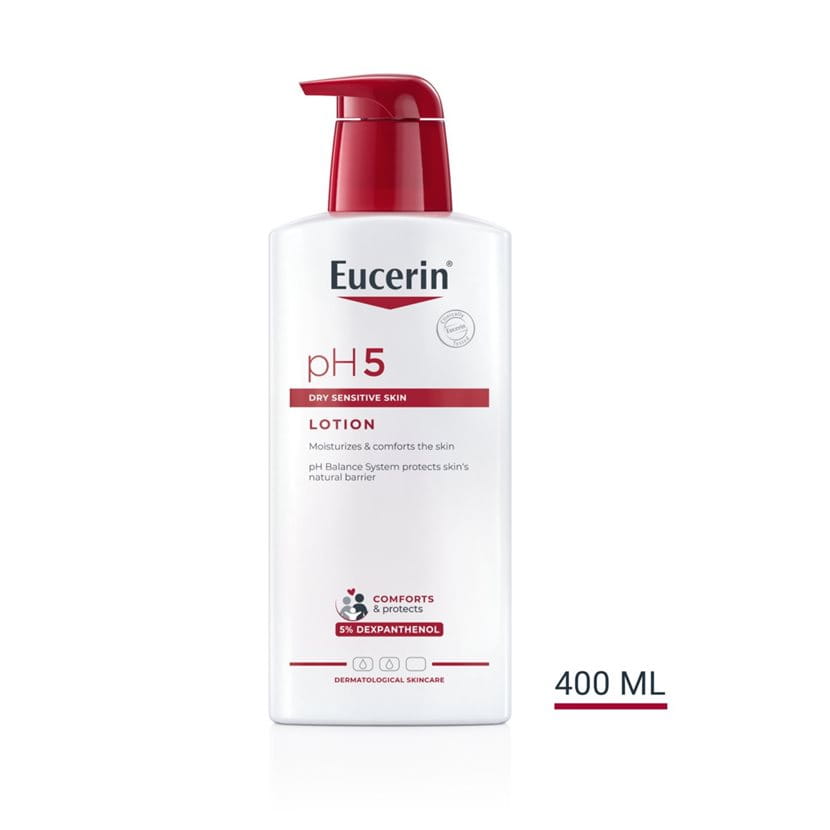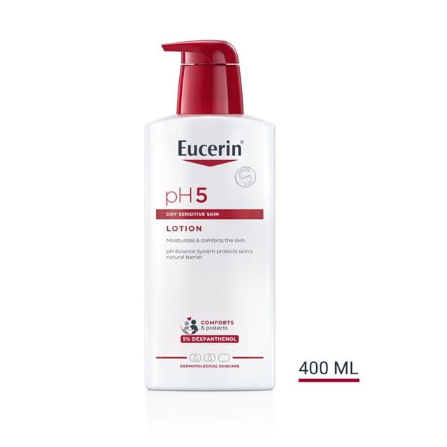 Eucerin pH5 Lotion är en mild men effektiv fuktlotion till kroppen och har en särskild sammansättning som gör torr och känslig hud mer motståndskraftig och mindre känslig. Det unika Eucerin pH Balance System innehåller en pH5 citratbuffert som återställer och stödjer hudens optimala pH-värde. Kroppslotionen innehåller även dexpantenol, som är en aktiv ingrediens som är känd för sina återhämtande egenskaper.
