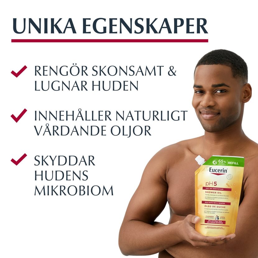 Känslig hud behöver skonsam rengöring för att motstå den dagliga påfrestningen den utsätts för. Skydda och lindra din hud med Eucerin pH5 Shower Oil och upplev en välmående hud. pH5 Shower Oil med vårdande oljor och Dexpanthenol rengör skonsamt och respekterar hudens mikrobiom. Huden blir skonsamt rengjord med optimalt pH-värde. Hudens känns mjuk och len och skyddas från att torka ut.